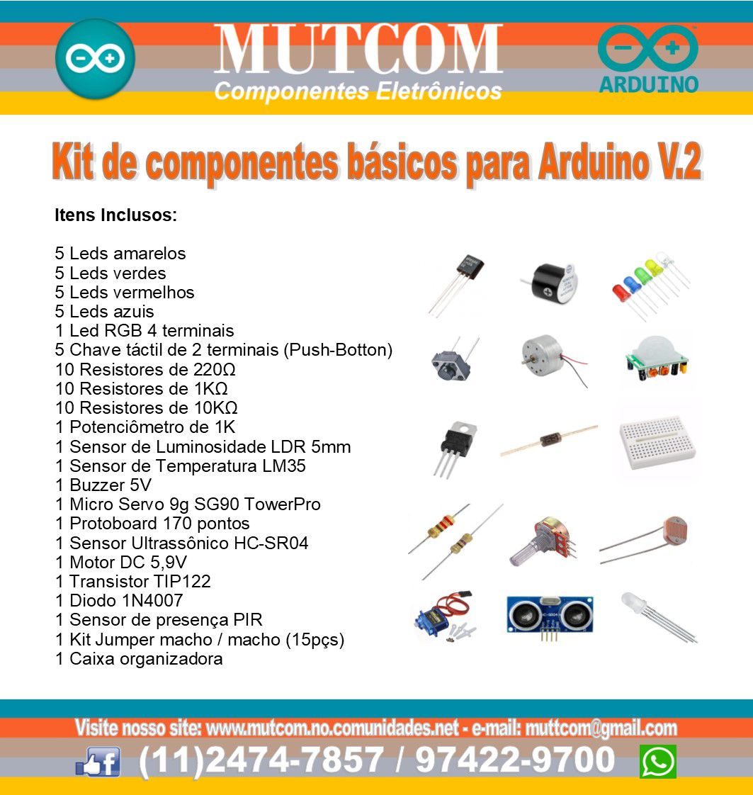 Ele é composto pelos componentes mais utilizados nos cursos básicos de Arduino e introdução a programação de robótica.